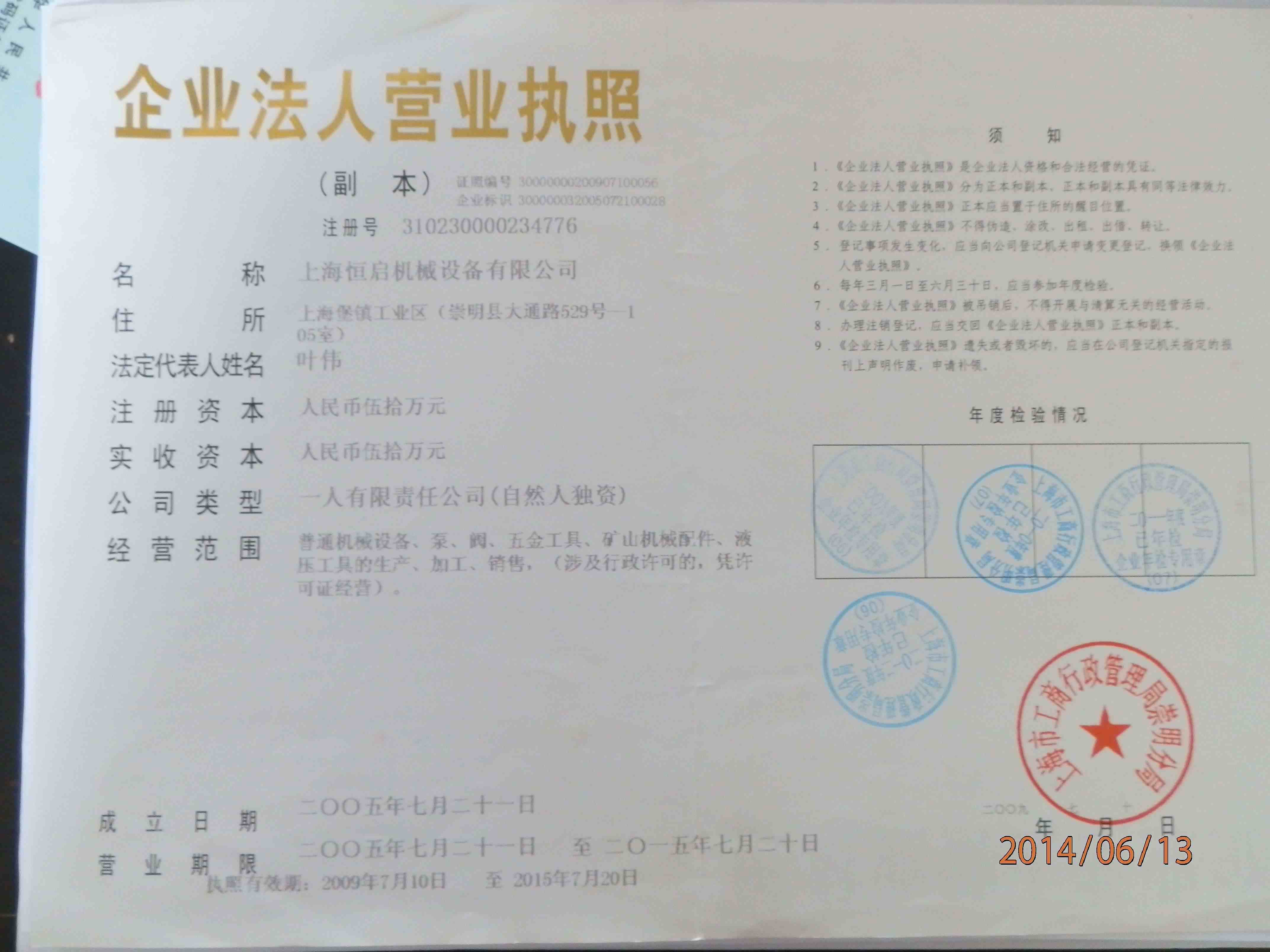 About us上海恒啟機(jī)械有限公司注冊(cè)成立于2000年,至今已有15年之久。期間不斷生產(chǎn)制造且經(jīng)營供應(yīng)手動(dòng)試壓泵、電動(dòng)打壓泵、電動(dòng)試壓泵、彎管機(jī)(手動(dòng)和電動(dòng))、液壓沖孔(手動(dòng)和電動(dòng))、切斷、彎排機(jī)、超高壓油泵(手動(dòng)和電動(dòng))以及礦山機(jī)、千斤頂、沖孔機(jī)、咬口機(jī)等,是一家中國大陸企業(yè)。